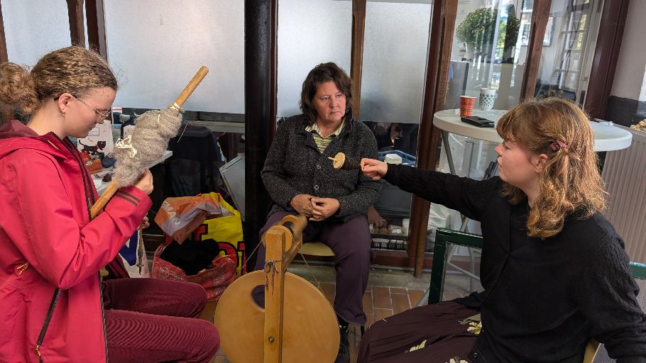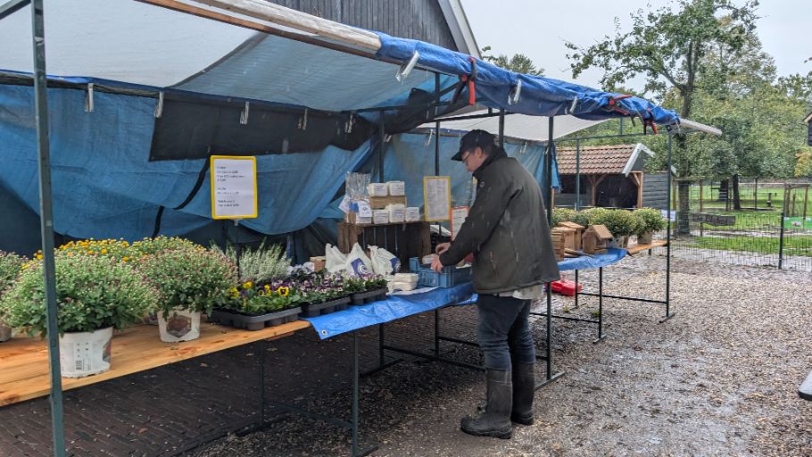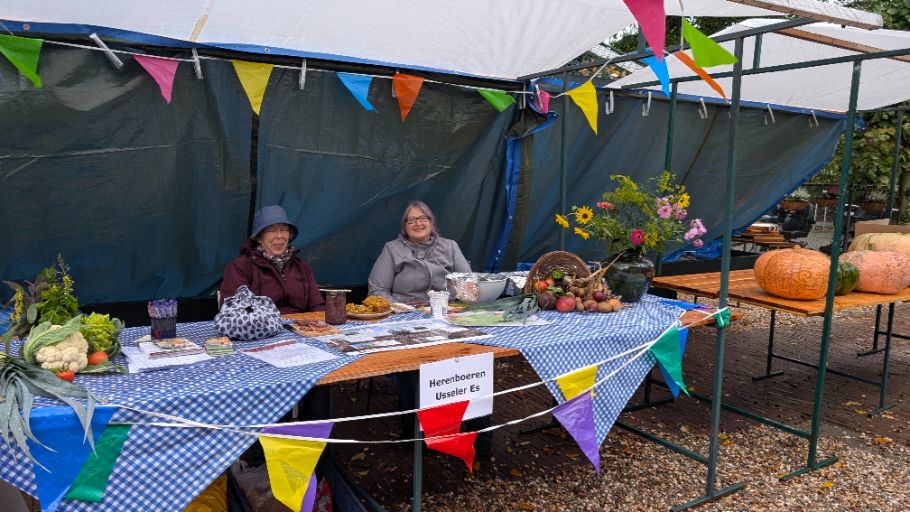 En natuurlijk waren er diverse kramen: Volkstuinvereniging het Vaneker met enorme pompoenen, De Herenboeren Usseler Es, Thee van Bams, en onze eigen kraam met najaarsbloeiers, appels uit de boomgaard, meelproducten van de Lonneker Molen en houtproducten van de Viermarken. Daarnaast kon je zien én proberen hoe wol wordt gesponnen.